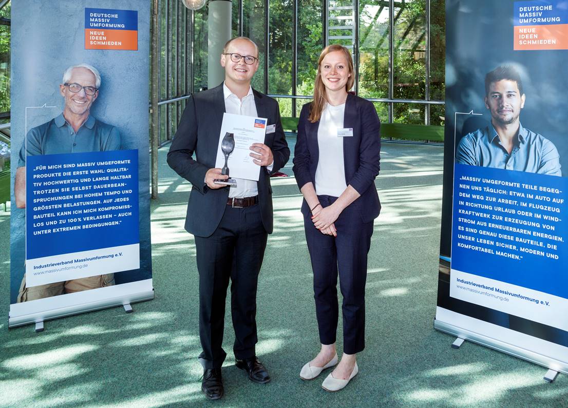 Julius Peddinghaus, Jahrgang 1994, studiert seit 2018 im Masterstudiengang Maschinenbau am Institut für Umformtechnik und Umformmaschinen (IFUM) der TU Hannover mit dem Schwerpunkt Fertigungstechnik bzw. Umformtechnik. Das Stipendium würdigt die herausragenden Leistungen sowie das besondere Interesse von Julius Peddinghaus an der Massivumformung. Seine Bachelorarbeit zum Thema "Neuauslegung eines Werkzeugsystems zur Effizienzsteigerung des Rüstvorgangs und der Wärmebilanz in der Warmmassivumformung" schloss er 2017 mit der Note 1,0 ab. Aktuell beschäftigt er sich im Rahmen einer Studienarbeit mit der thermomechanischen Wechselbelastung von Schmiedeprozessen und wie ein Beitrag zur Verringerung von thermisch bedingtem Werkzeugverschleiß möglich ist. Seit dem ersten Semester ist er im Bereich Verschleiß- und Tribologieuntersuchungen in der Warmmassivumformung als hilfswissenschaftlicher Mitarbeiter am IFUM tätig. Sein Interesse für Massivumformung wurde bereits zu Schulzeiten geweckt – hier sammelte er durch Ferienjobs erste praktische Erfahrungen in diesem Bereich.